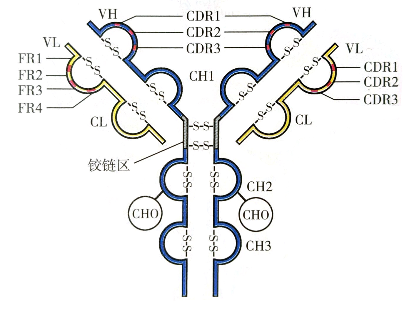 抗体的基本结构是由两条完全相同的重链(heavy chain,H)和两条完全相同的轻链(light chain,L)通过二硫键(-S-S-)连接成 Y 形的单体。